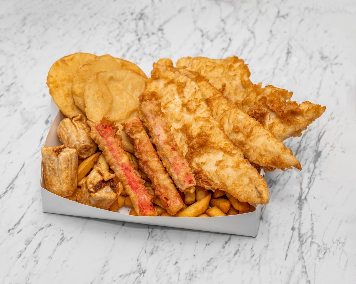If you're dining with friends or family, the Dinner for 3 option at A$45.00 provides a generous selection featuring three pieces of fish, crab sticks, homemade potato cakes, and dim sims, all nestled among a comforting pile of chips. It’s ideal for sharing, making it perfect for social nights or casual get-togethers.